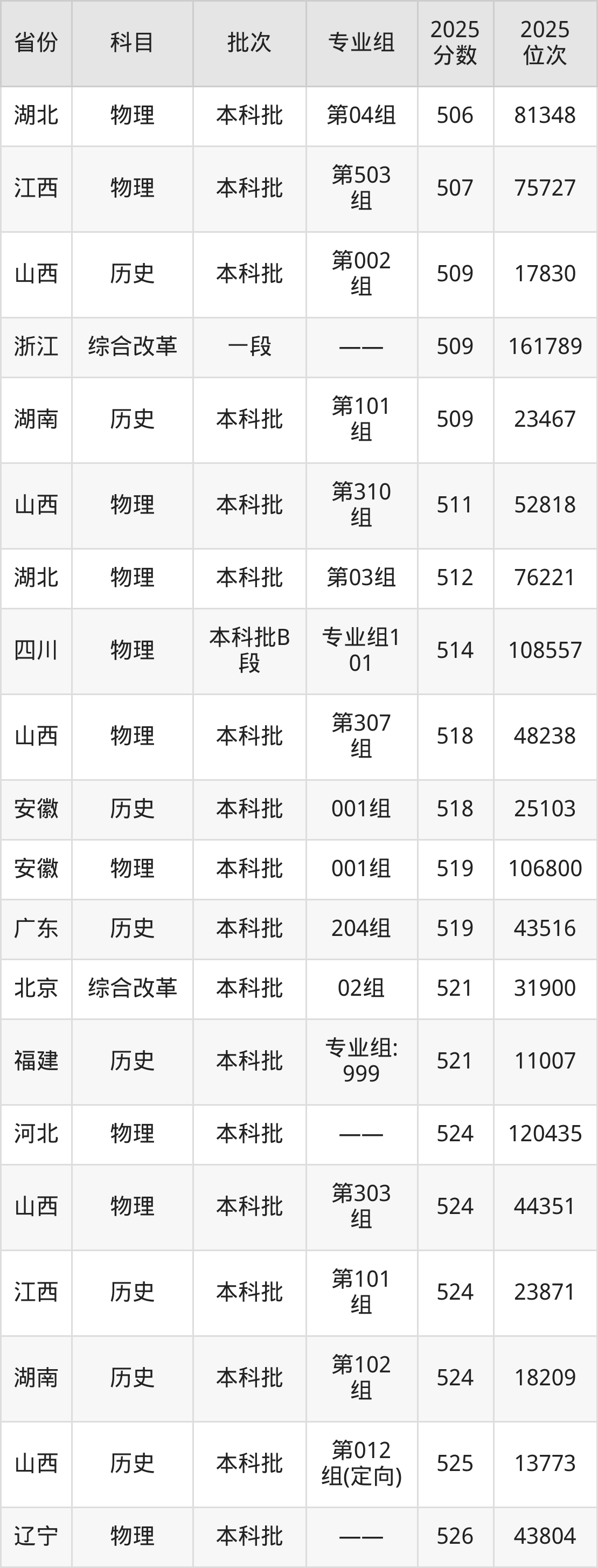 2025年山西大同大学在各省普通批录取分数线一览表: