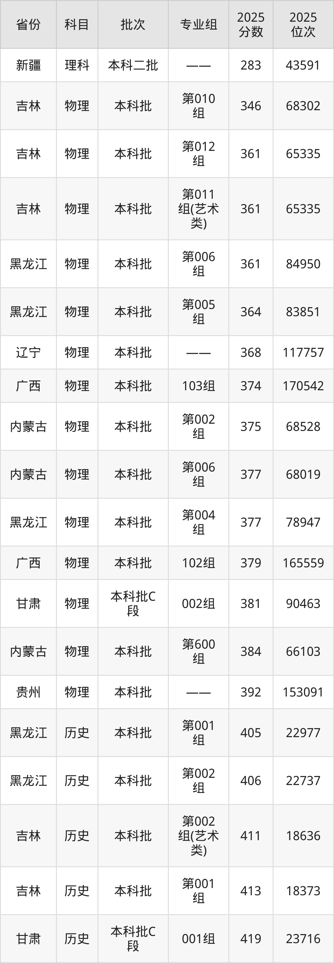 2025年长春人文学院在各省普通批录取分数线一览表: