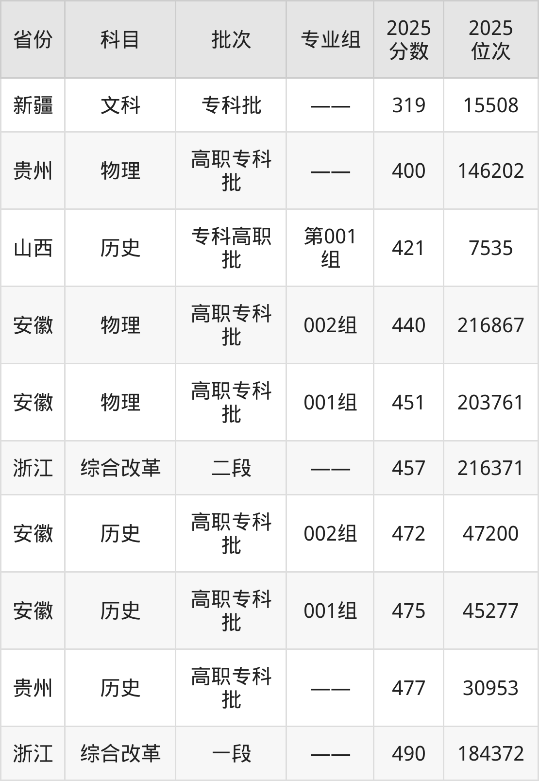 2025年浙江警官职业学院在各省历史类和文科的录取分数线位于319分-477分之间。