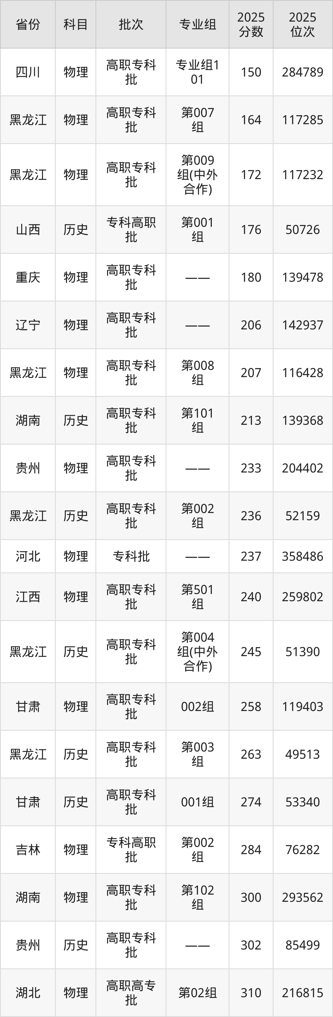 最低录取分数线是150分,对应位次是284789名,招生地区为四川;