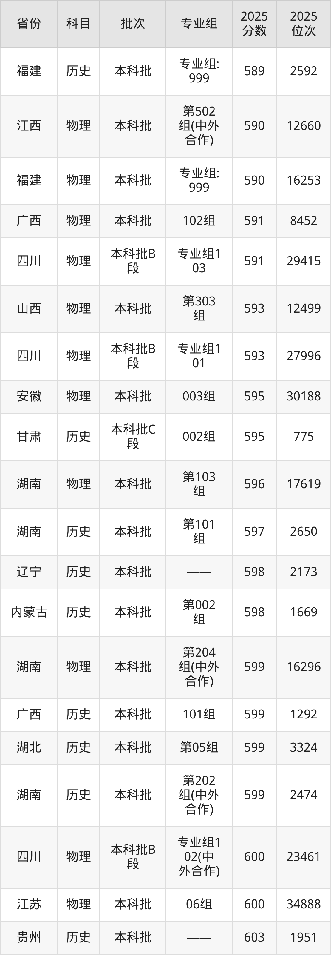 2025年西南政法大学在各省普通批录取分数线一览表: