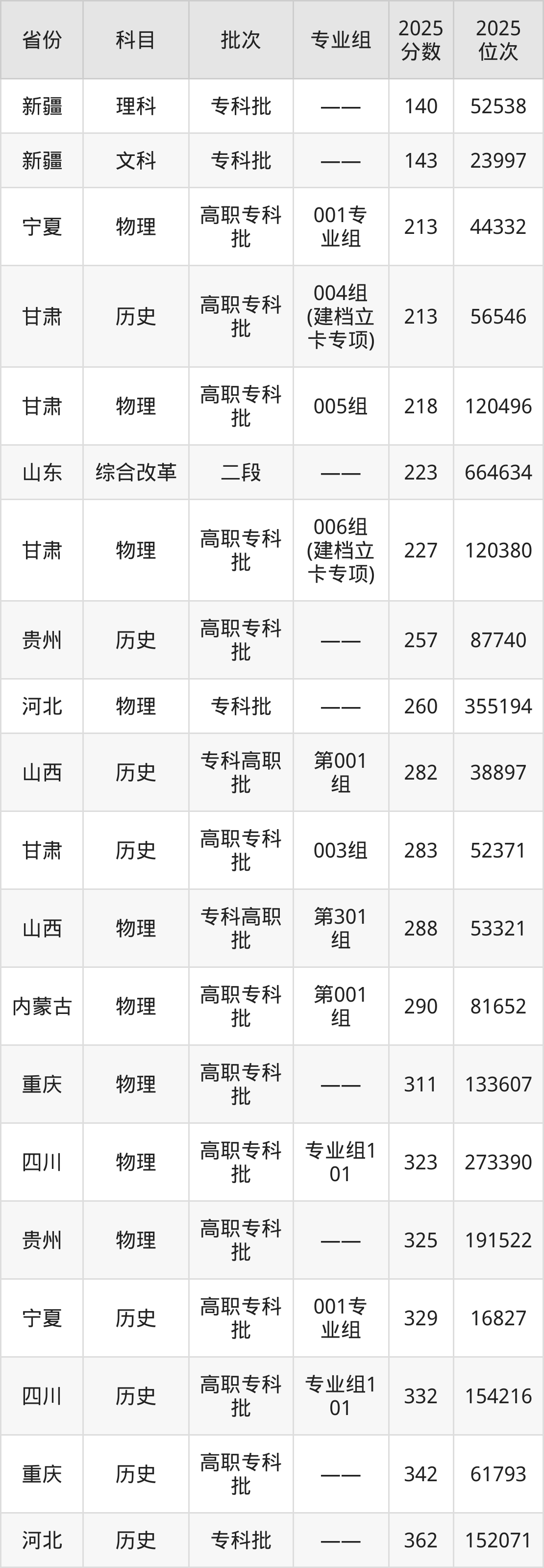 2025年甘肃畜牧工程职业技术学院在各省普通批录取分数线一览表: