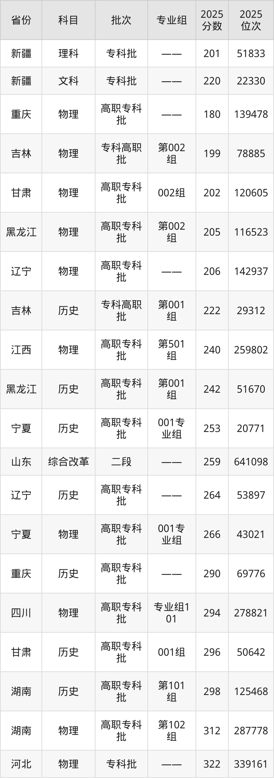 2025年博尔塔拉职业技术学院在各省普通批录取分数线一览表: