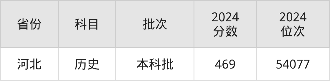 最低录取分数线是469分,对应位次是54077名,招生地区为河北。