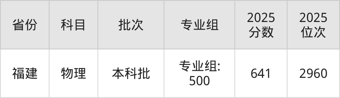 最低录取分数线是641分,对应位次是2960名,招生地区为福建。