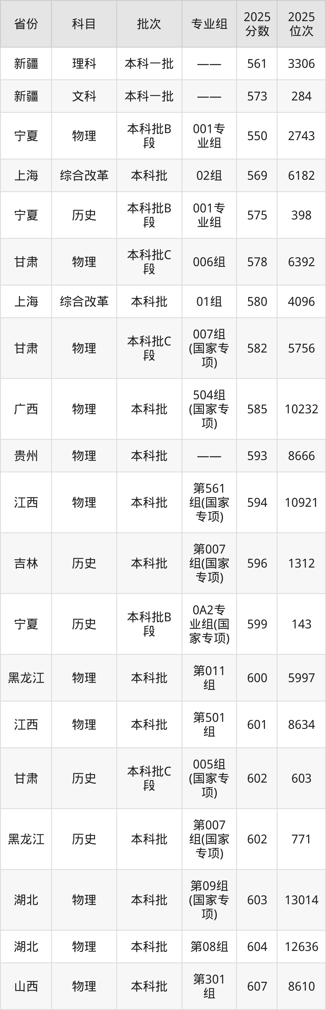 最低录取分数线是573分,对应位次是284名,招生地区为新疆;
