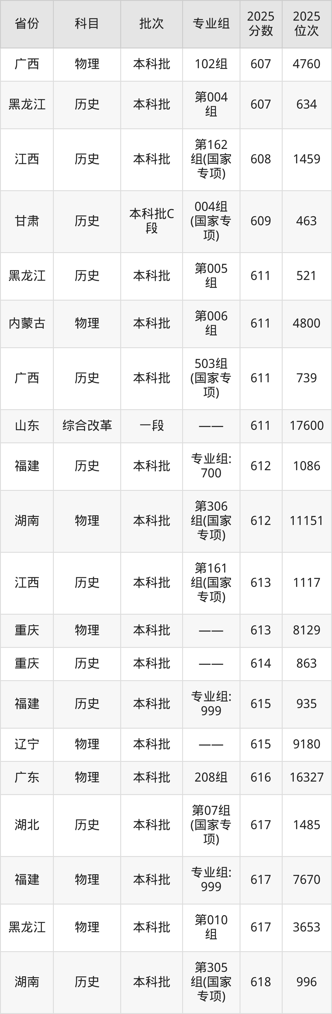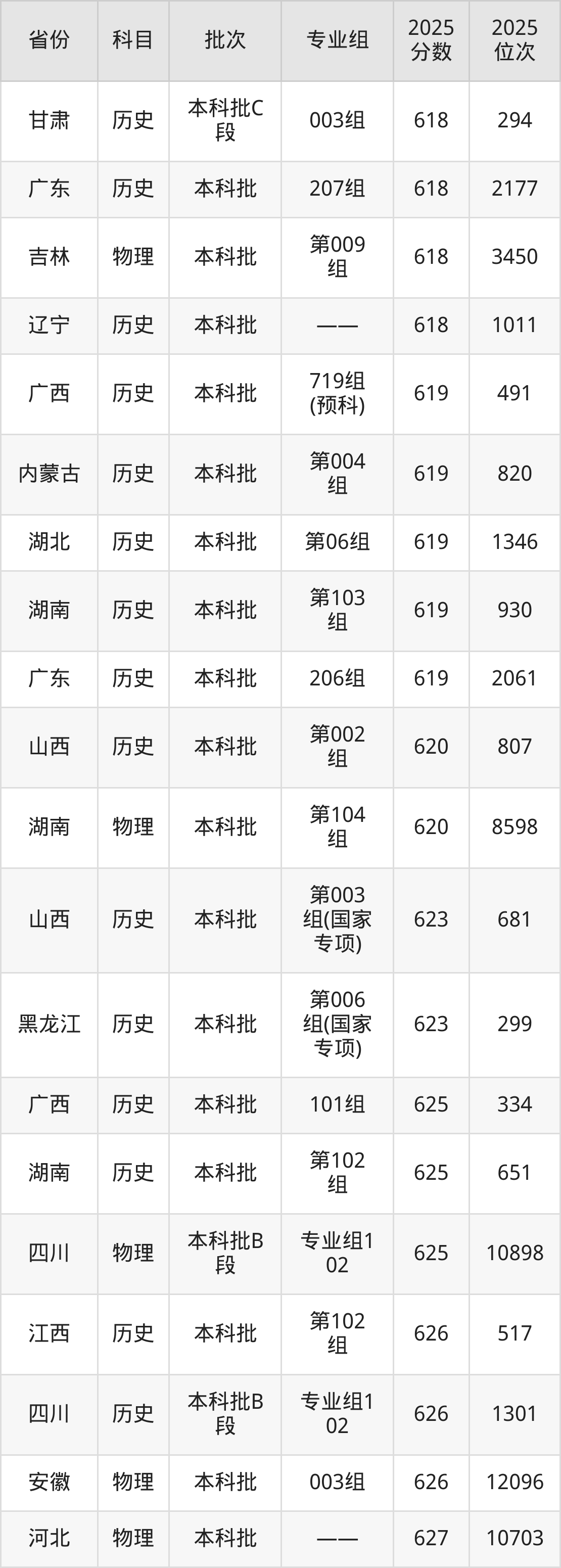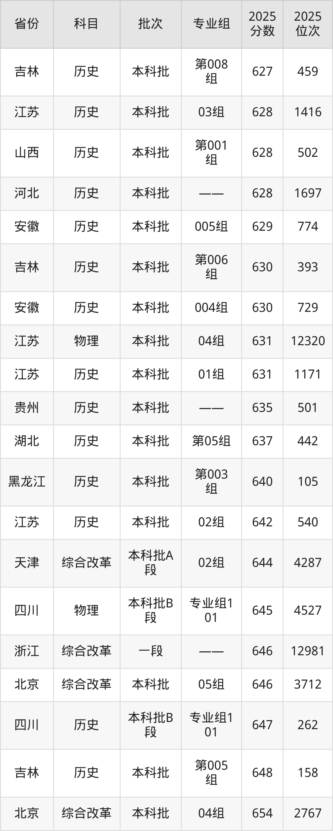 2025年中国政法大学在各省普通批录取分数线一览表: