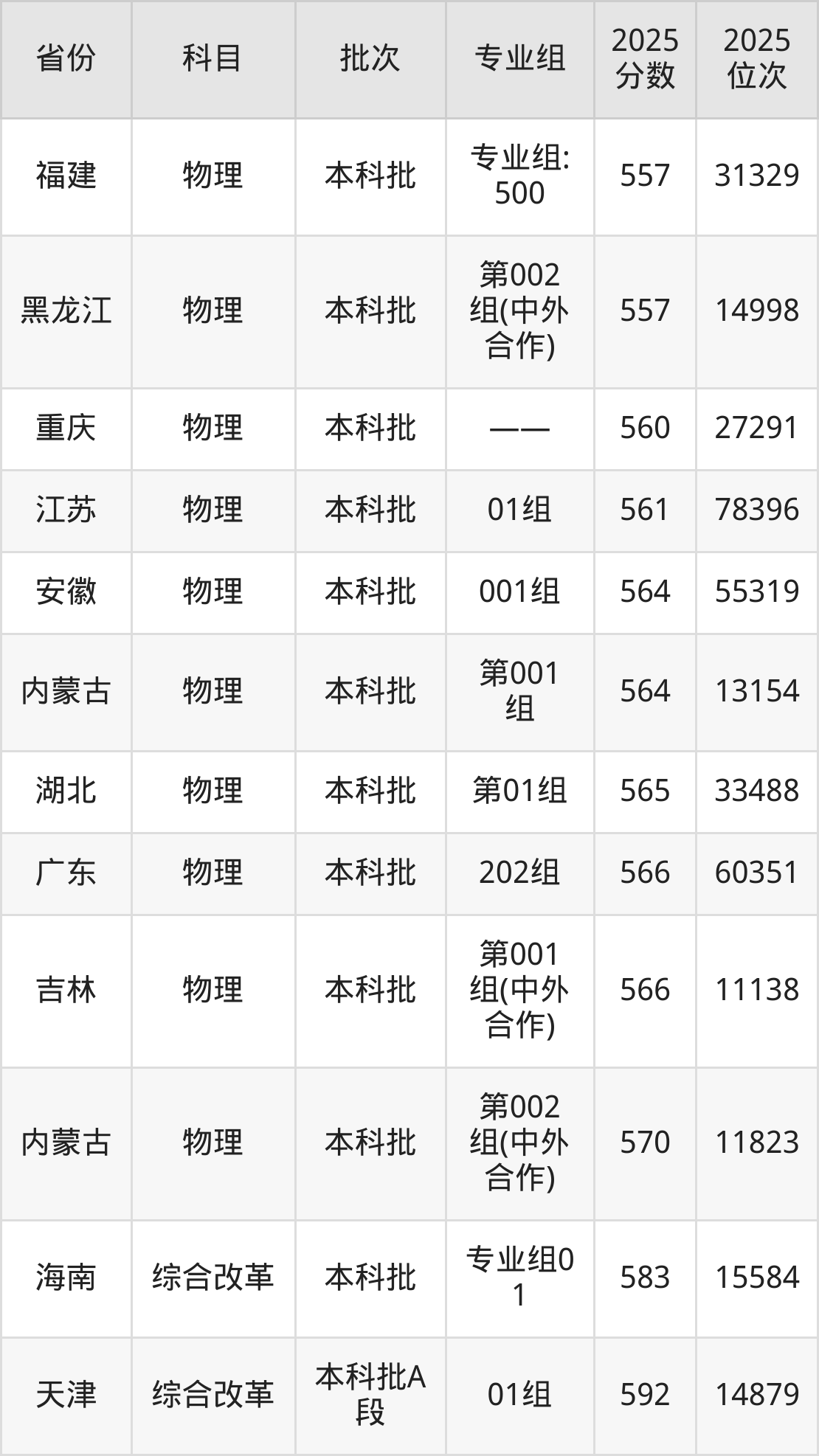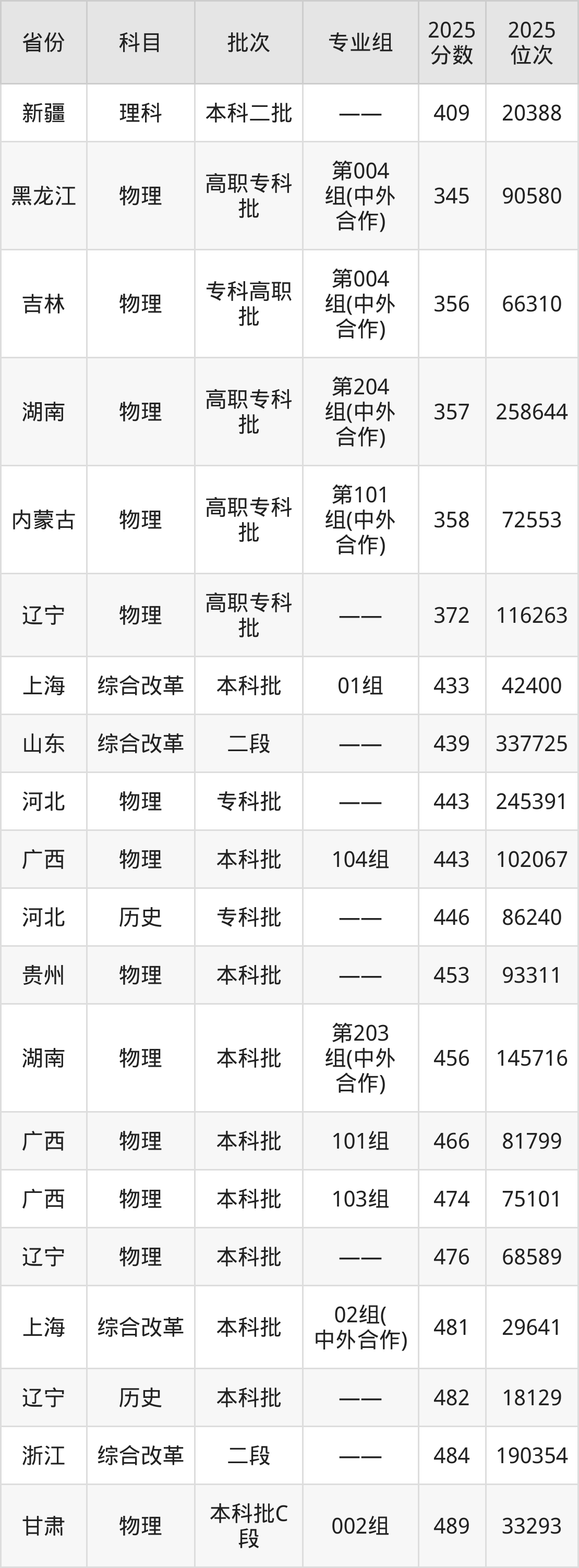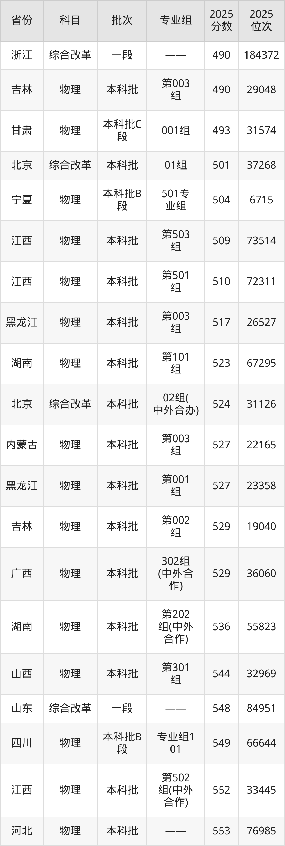 2025年沈阳工程学院在各省普通批录取分数线一览表: