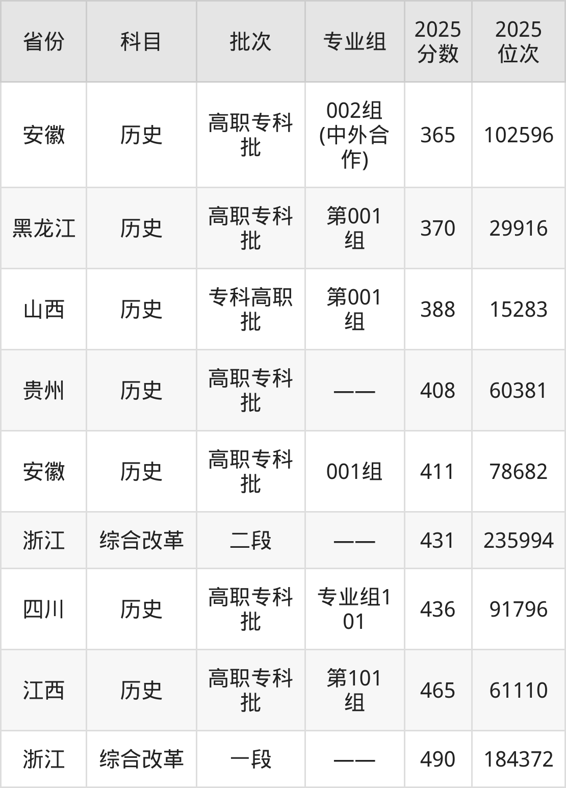 2025年浙江纺织服装职业技术学院在各省普通批录取分数线一览表: