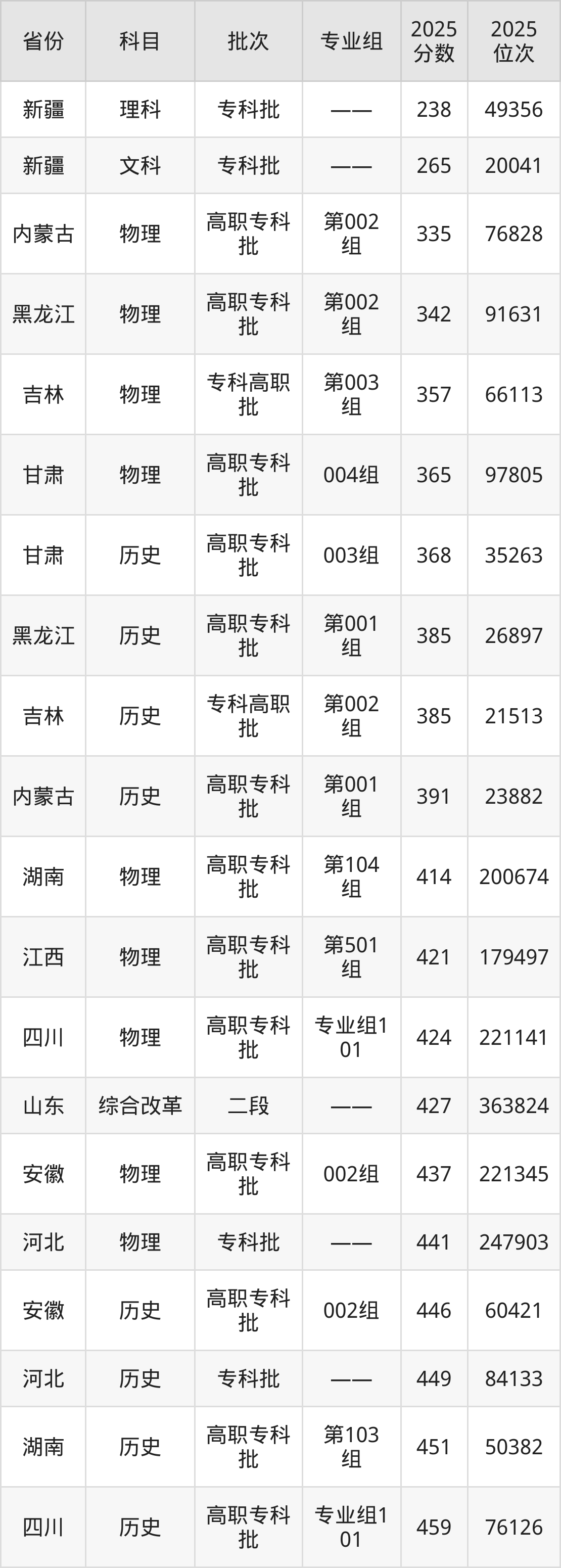 最低录取分数线是265分,对应位次是20041名,招生地区为新疆;