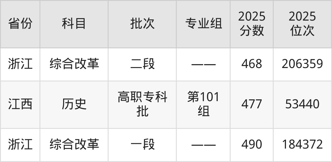 2025年浙江建设职业技术学院在各省普通批录取分数线一览表: