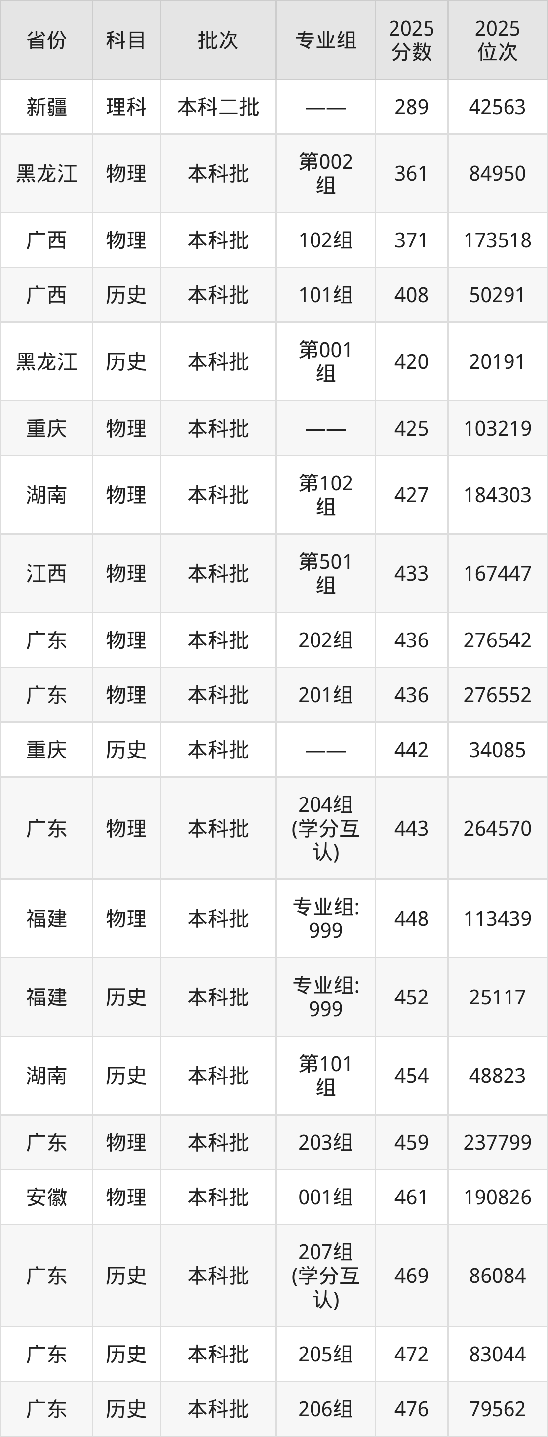 最低录取分数线是289分,对应位次是42563名,招生地区为新疆;