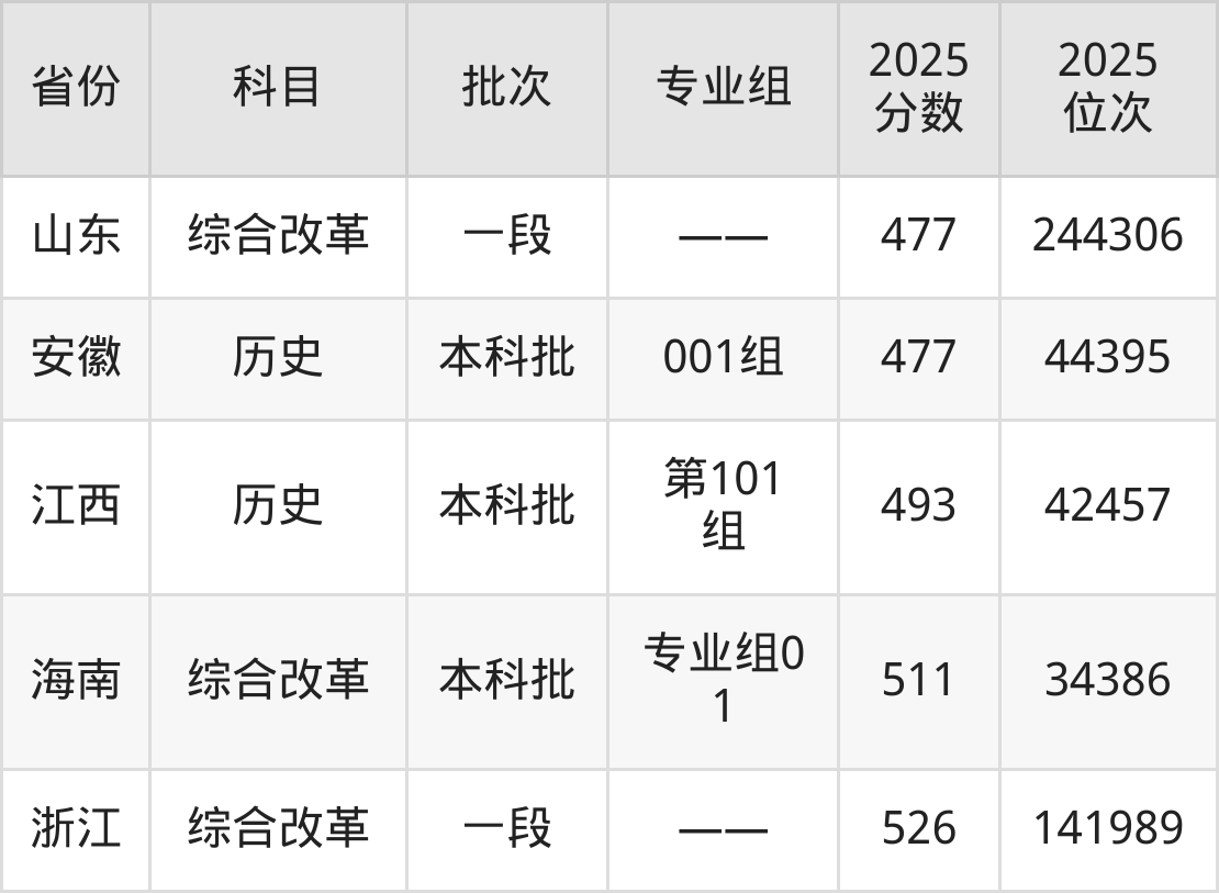 最低录取分数线是477分,对应位次是244306名,招生地区为山东;