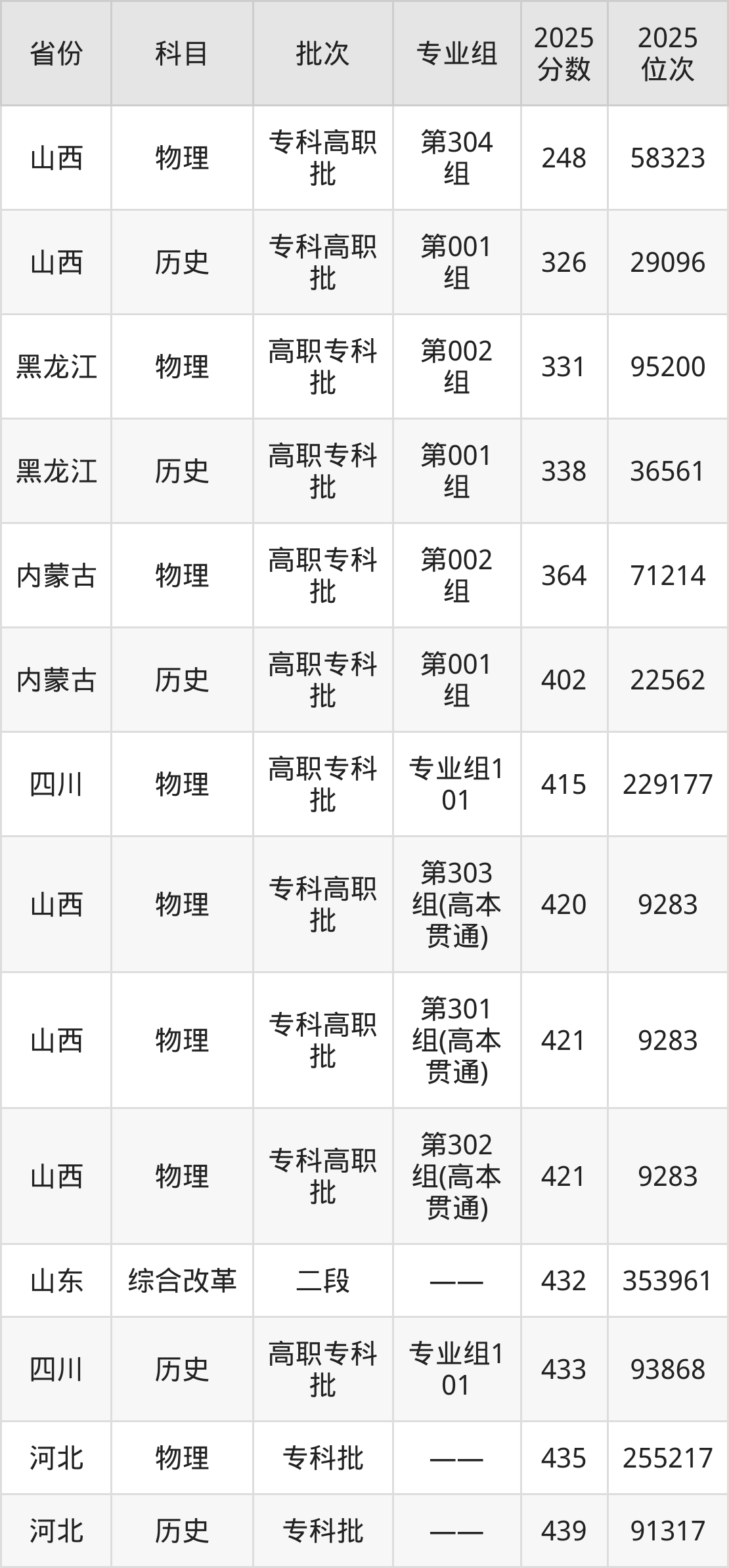 2025年山西机电职业技术学院在各省普通批录取分数线一览表: