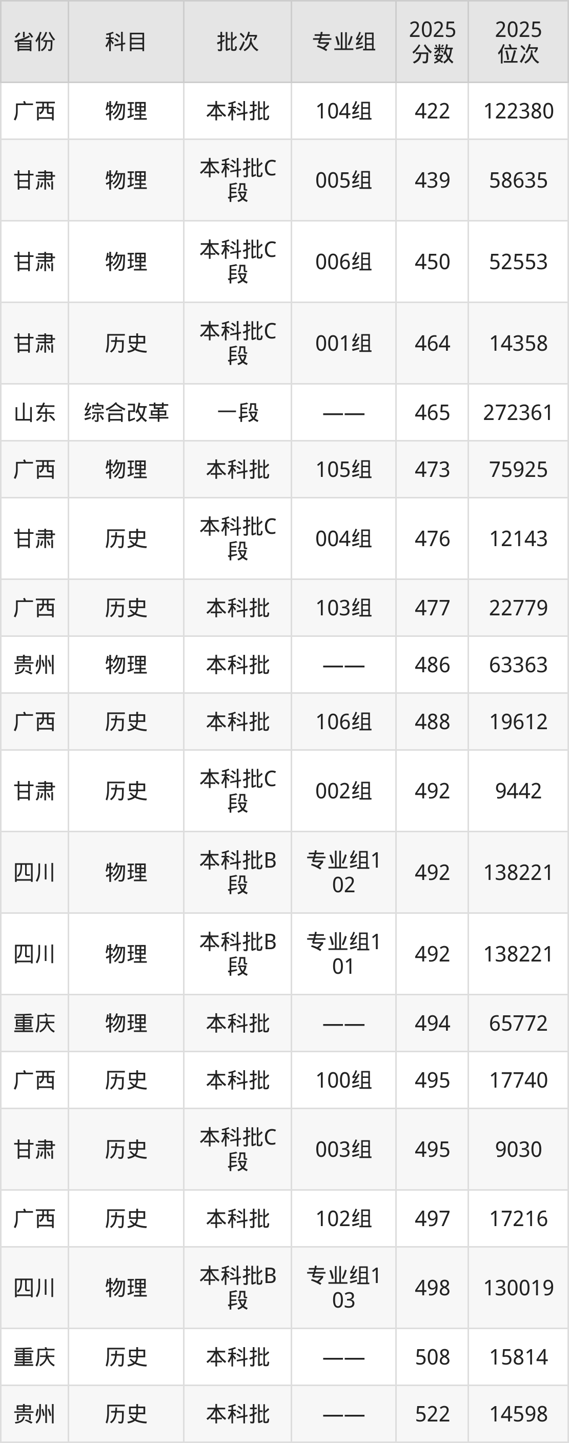 最低录取分数线是422分,对应位次是122380名,招生地区为广西;