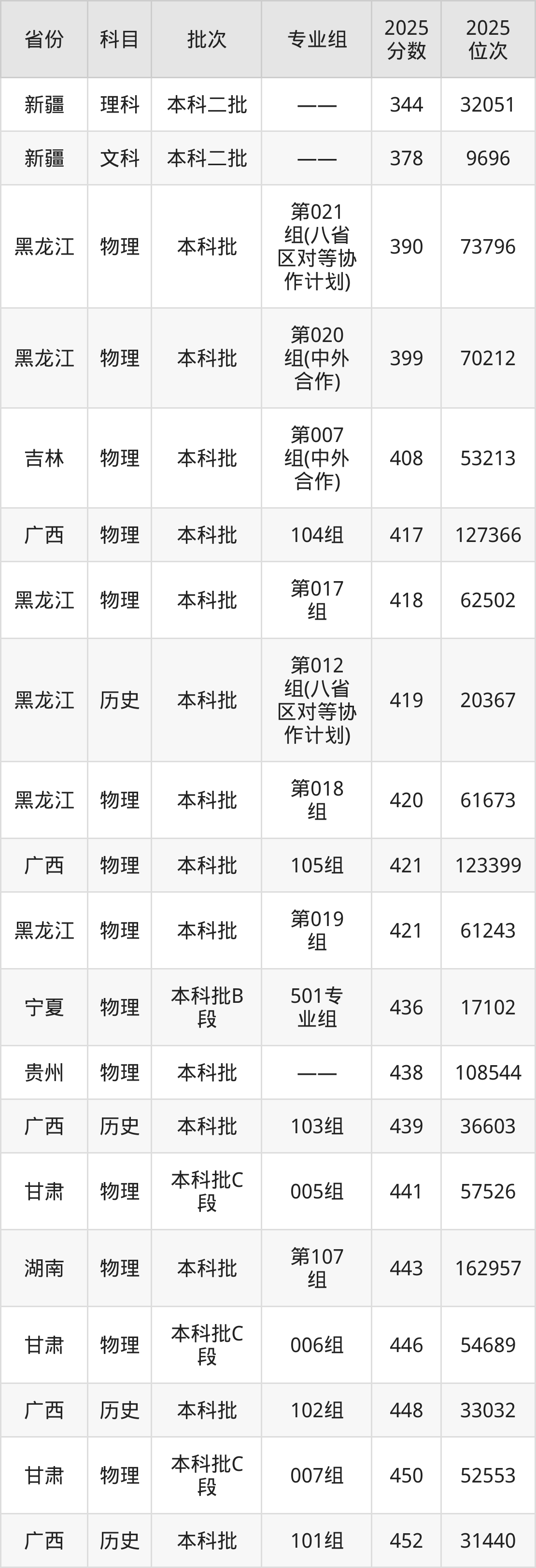 最低录取分数线是344分,对应位次是32051名,招生地区为新疆;