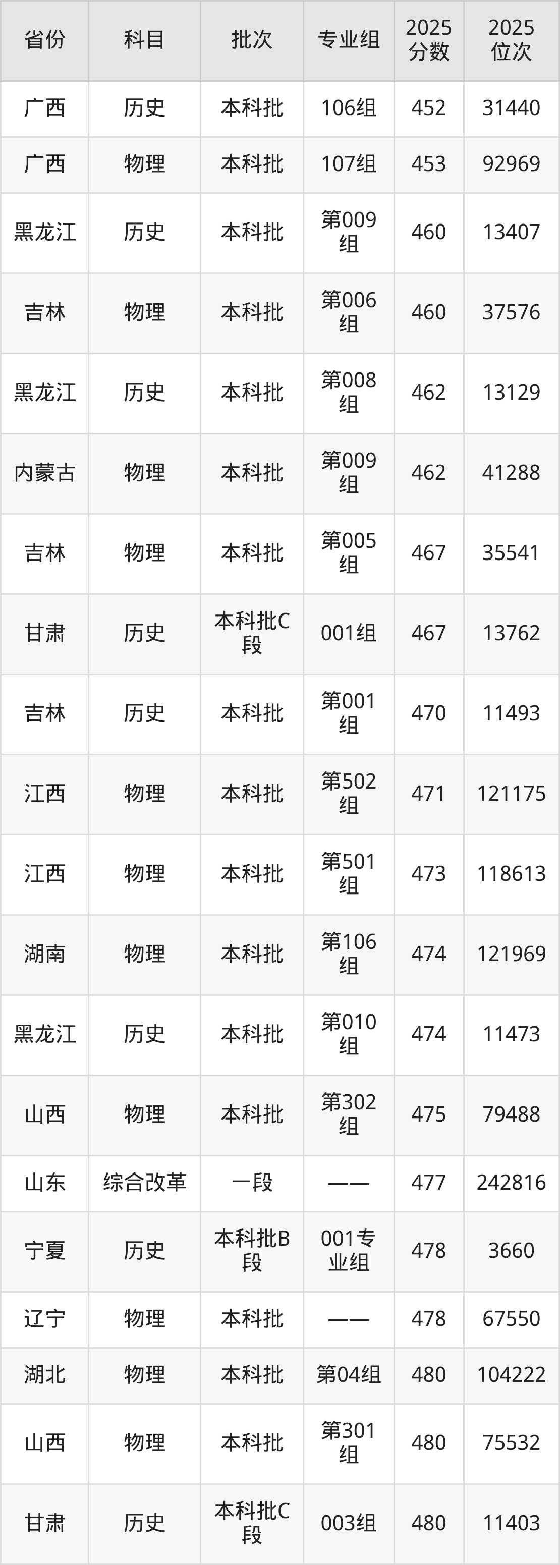 最低录取分数线是477分,对应位次是242816名,招生地区为山东;