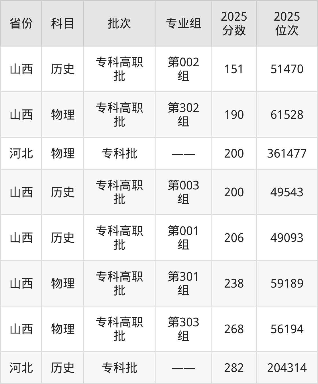 最低录取分数线是190分,对应位次是61528名,招生地区为山西;