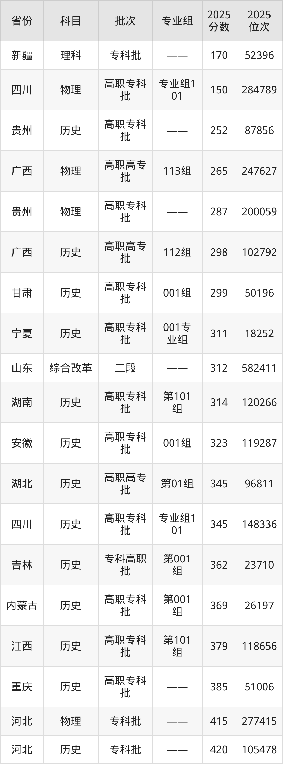 最低录取分数线是150分,对应位次是284789名,招生地区为四川;