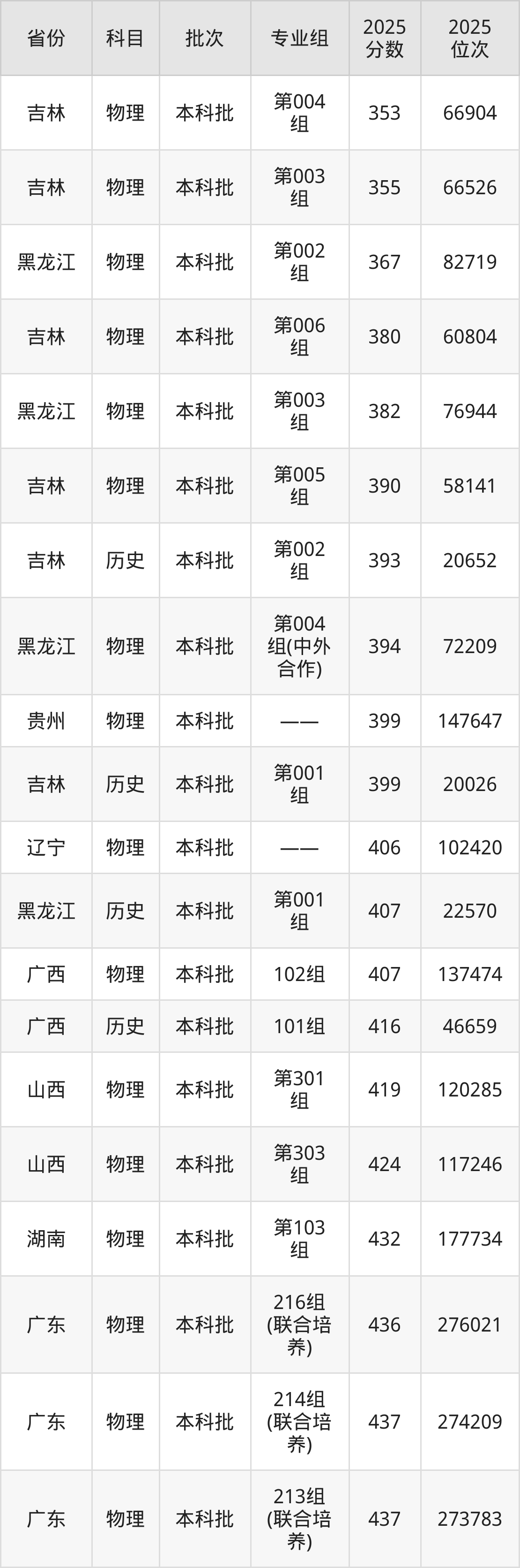 最低录取分数线是393分,对应位次是20652名,招生地区为吉林;