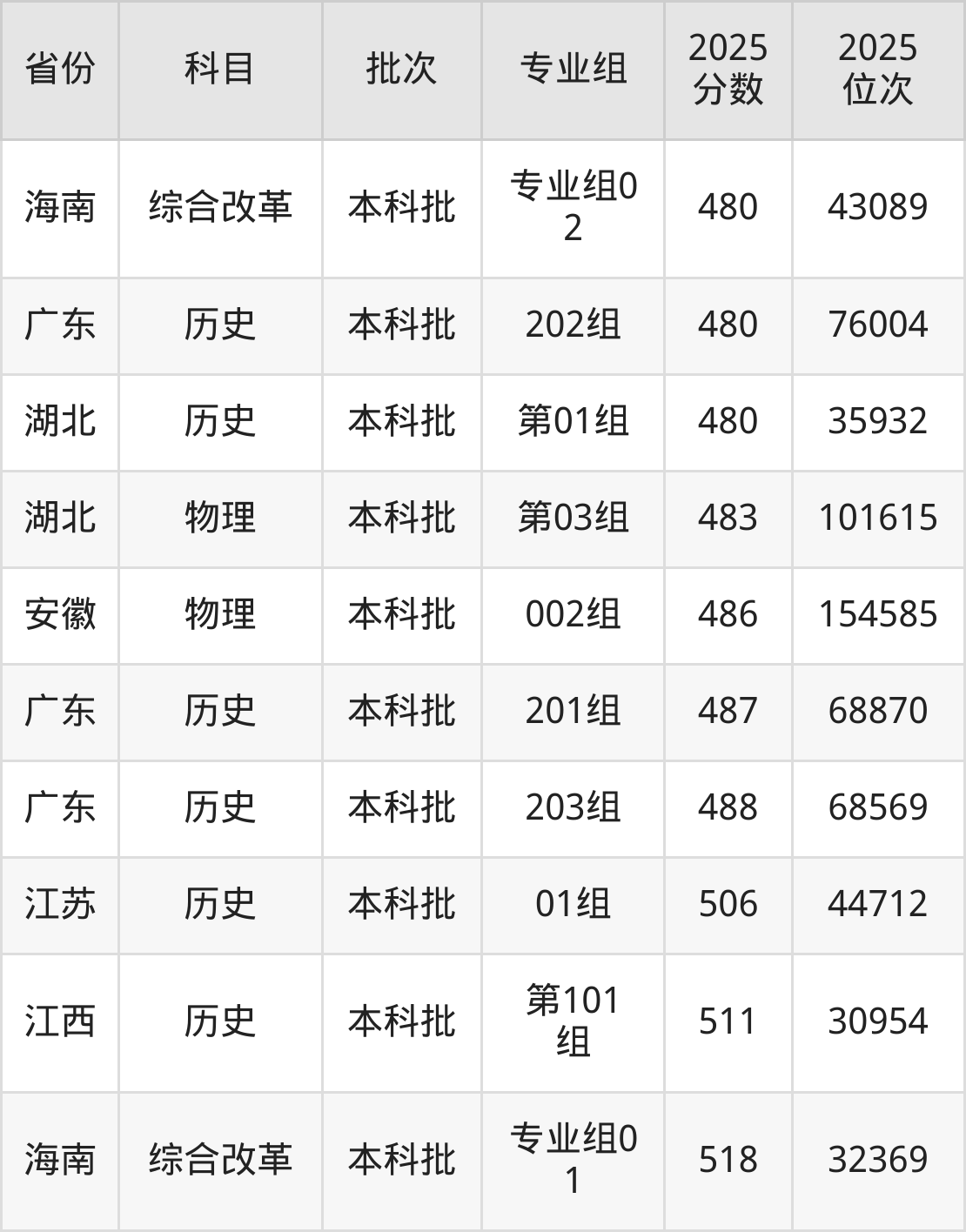 2025年广州南方学院在各省普通批录取分数线一览表: