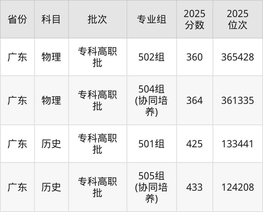 最低录取分数线是425分,对应位次是133441名,招生地区为广东;
