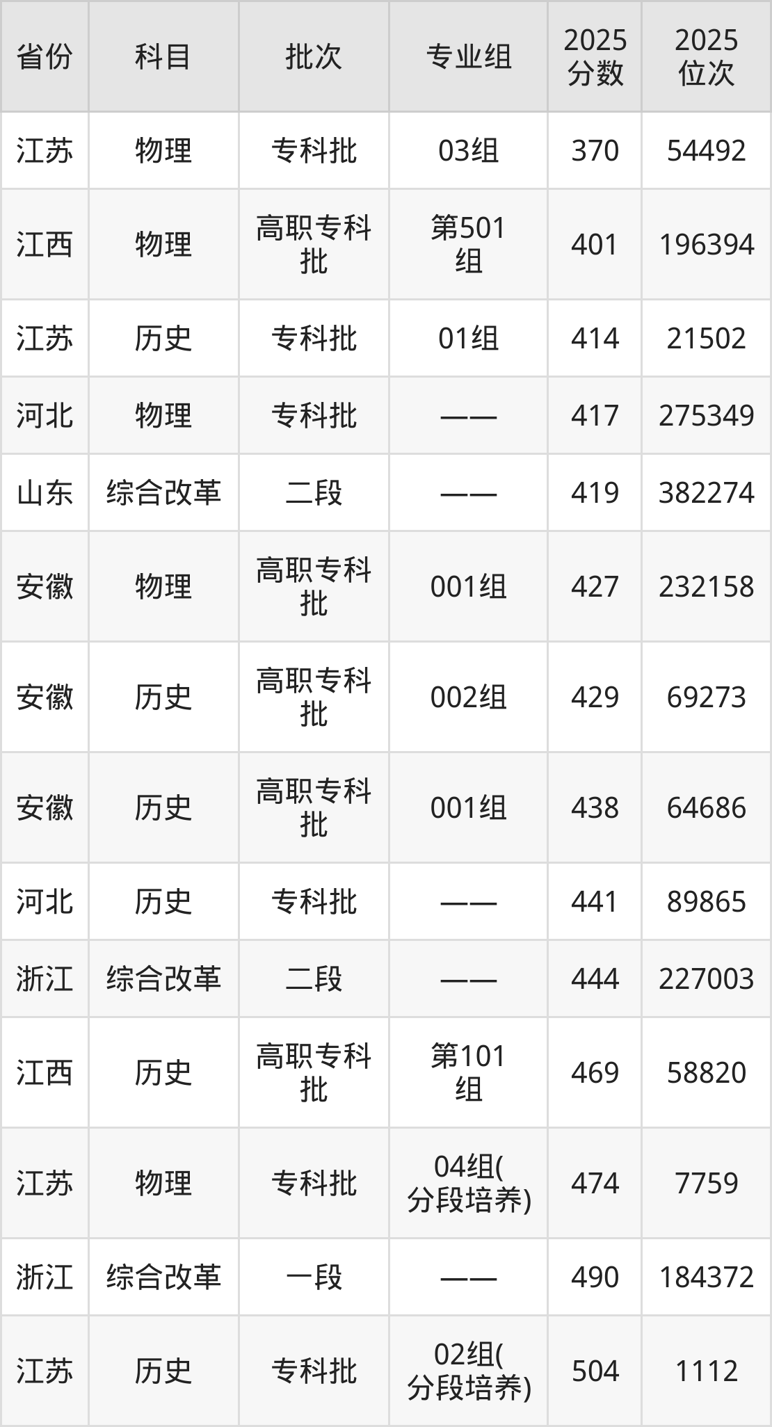 2025年徐州生物工程职业技术学院在各省普通批录取分数线一览表: