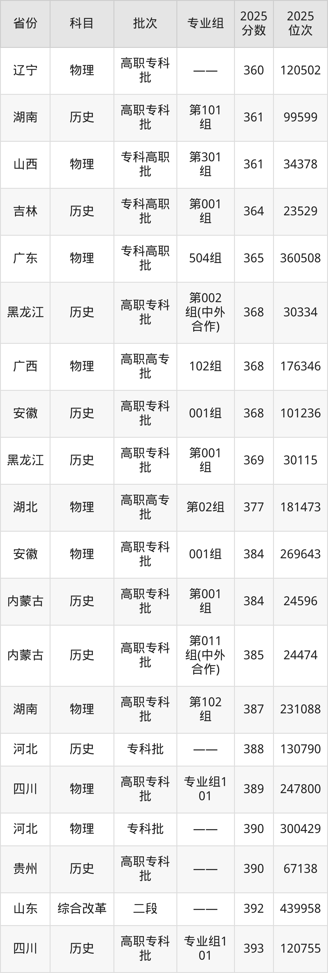 最低录取分数线是392分,对应位次是439958名,招生地区为山东;