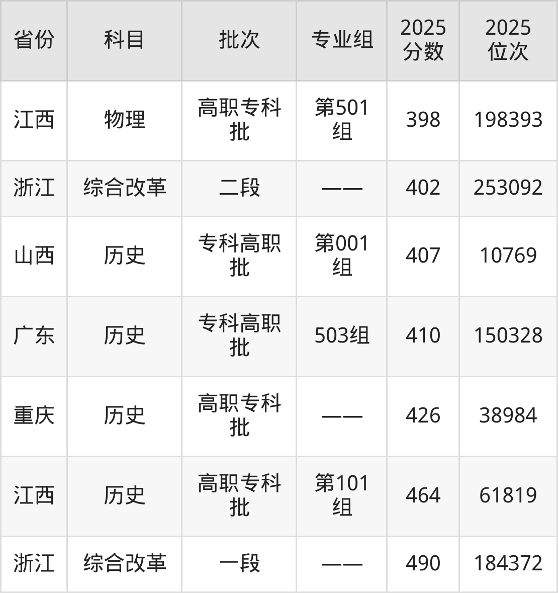 最高录取分数线是398分,对应位次是198393名,招生地区为江西。