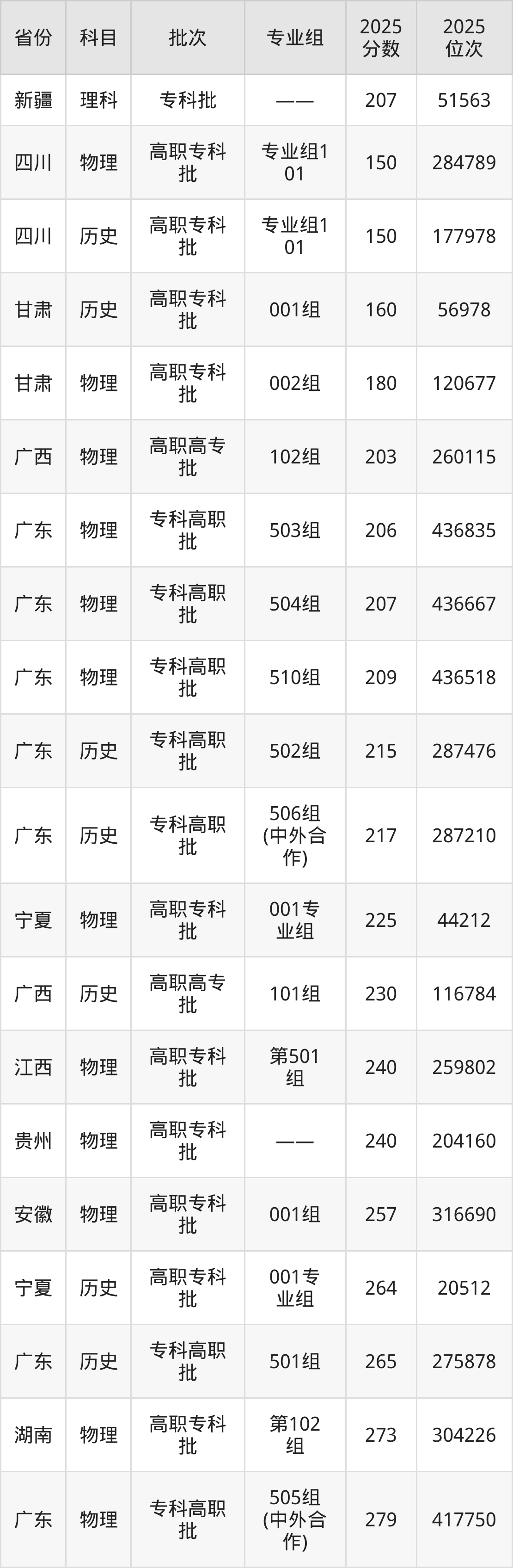 2025年广州东华职业学院在各省物理类和理科的录取分数线位于150分-279分之间。