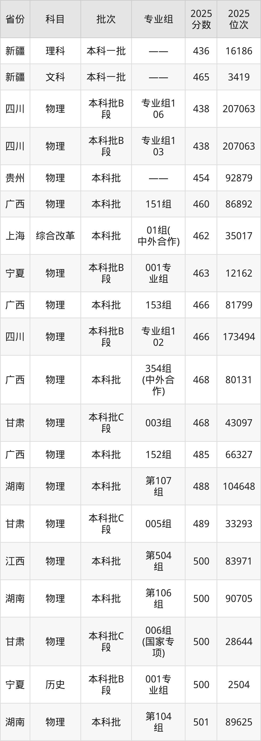 最低录取分数线是436分,对应位次是16186名,招生地区为新疆;