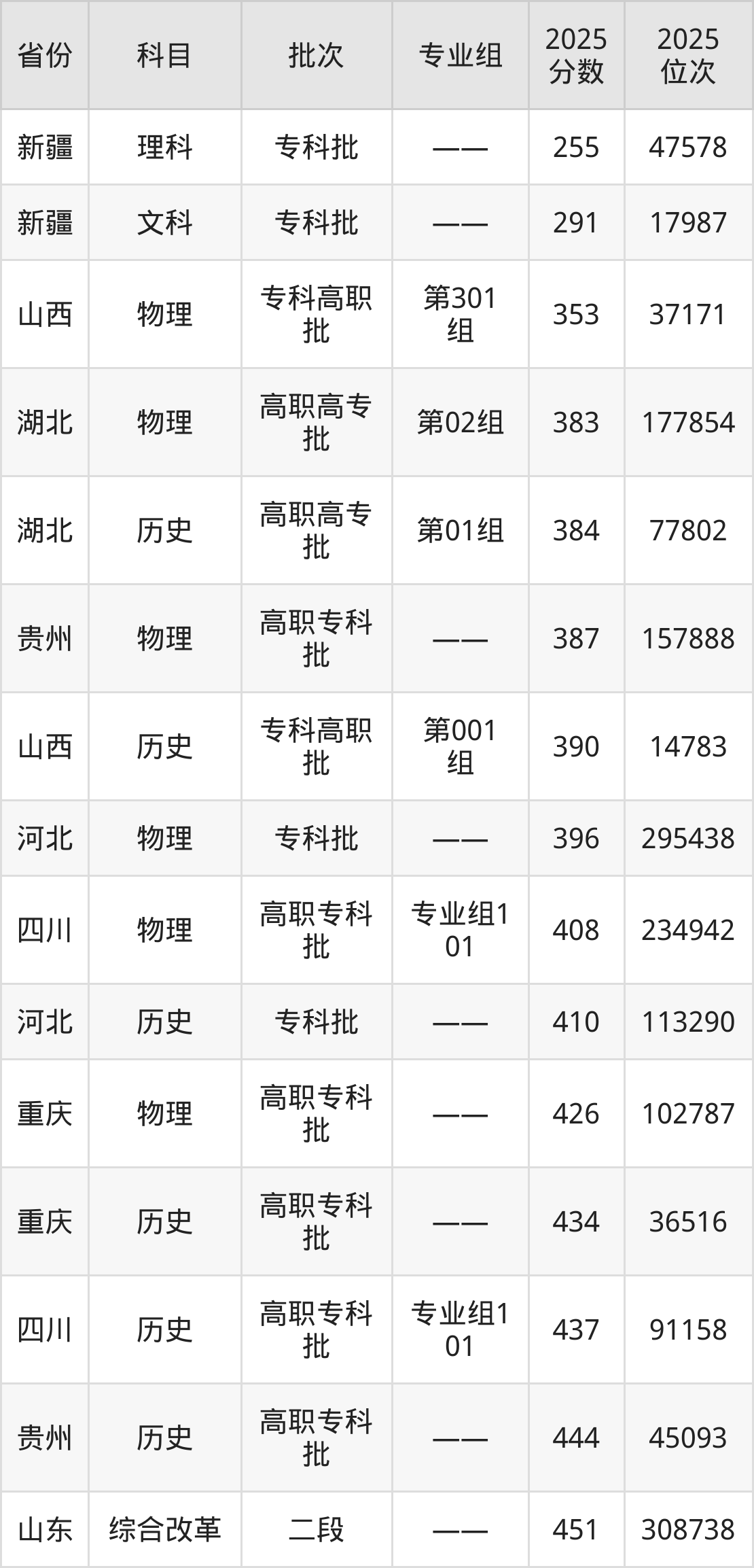 2025年河北司法警官职业学院在各省普通批录取分数线一览表: