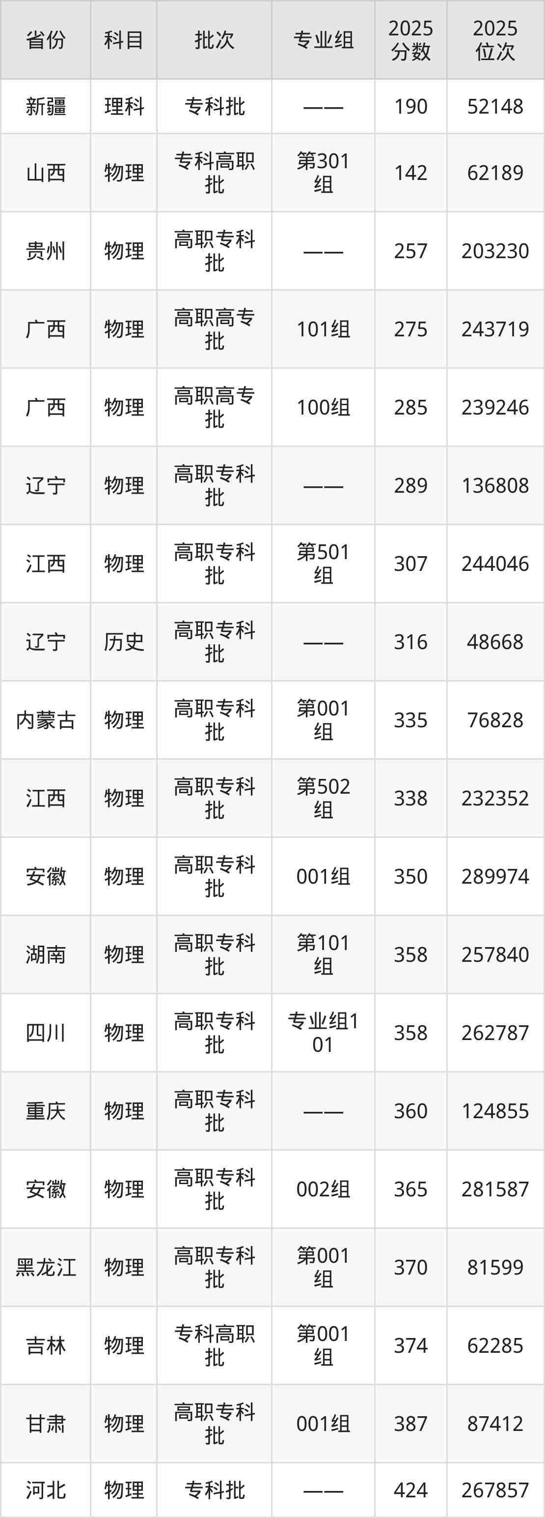 2025年辽宁石化职业技术学院在各省普通批录取分数线一览表: