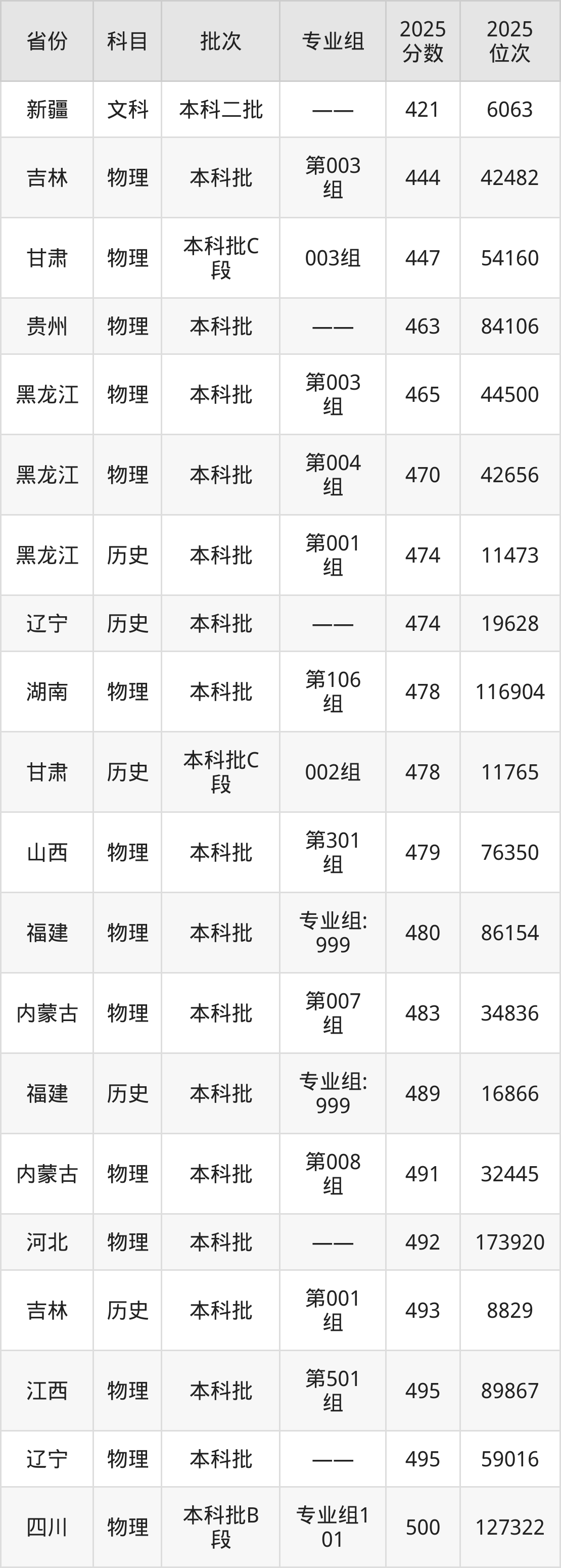 最低录取分数线是421分,对应位次是6063名,招生地区为新疆;