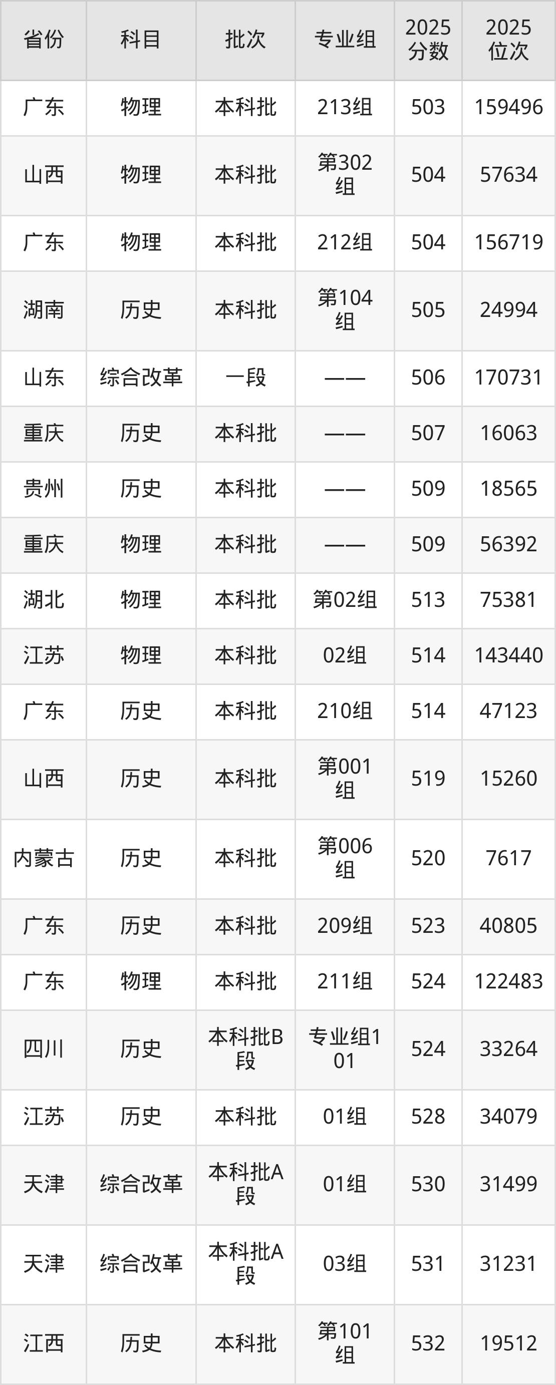 最低录取分数线是506分,对应位次是170731名,招生地区为山东;