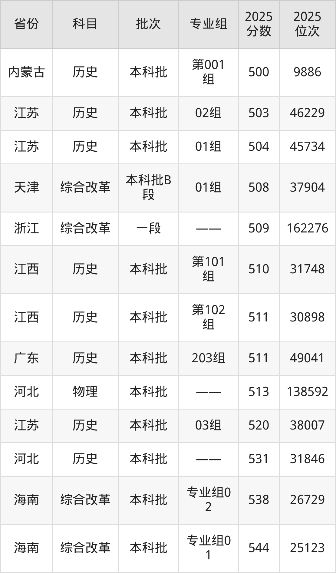 最高录取分数线是544分,对应位次是25123名,招生地区为海南。