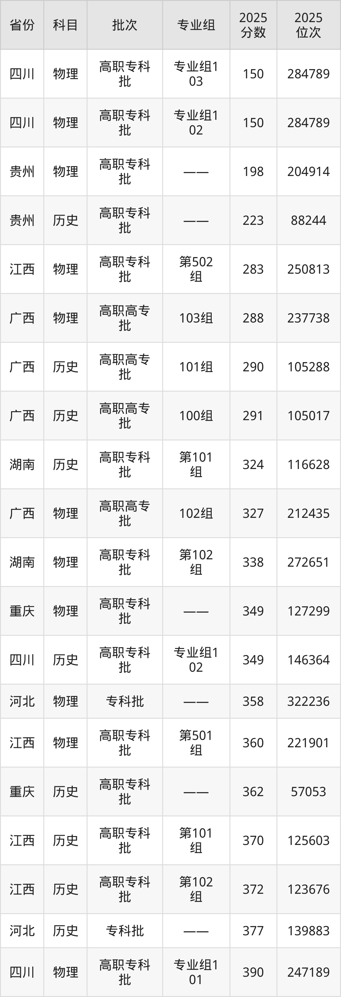 最低录取分数线是150分,对应位次是284789名,招生地区为四川;