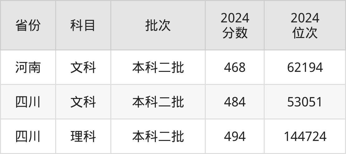 最低录取分数线是494分,对应位次是144724名,招生地区为四川。