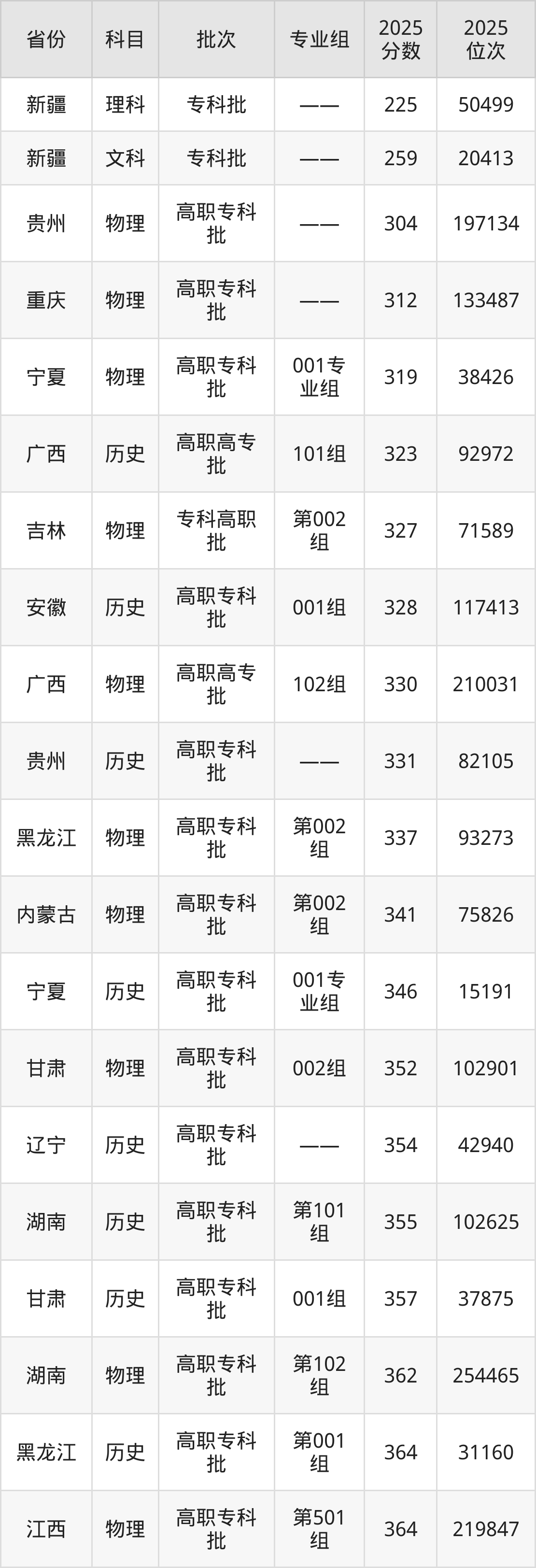 最低录取分数线是259分,对应位次是20413名,招生地区为新疆;