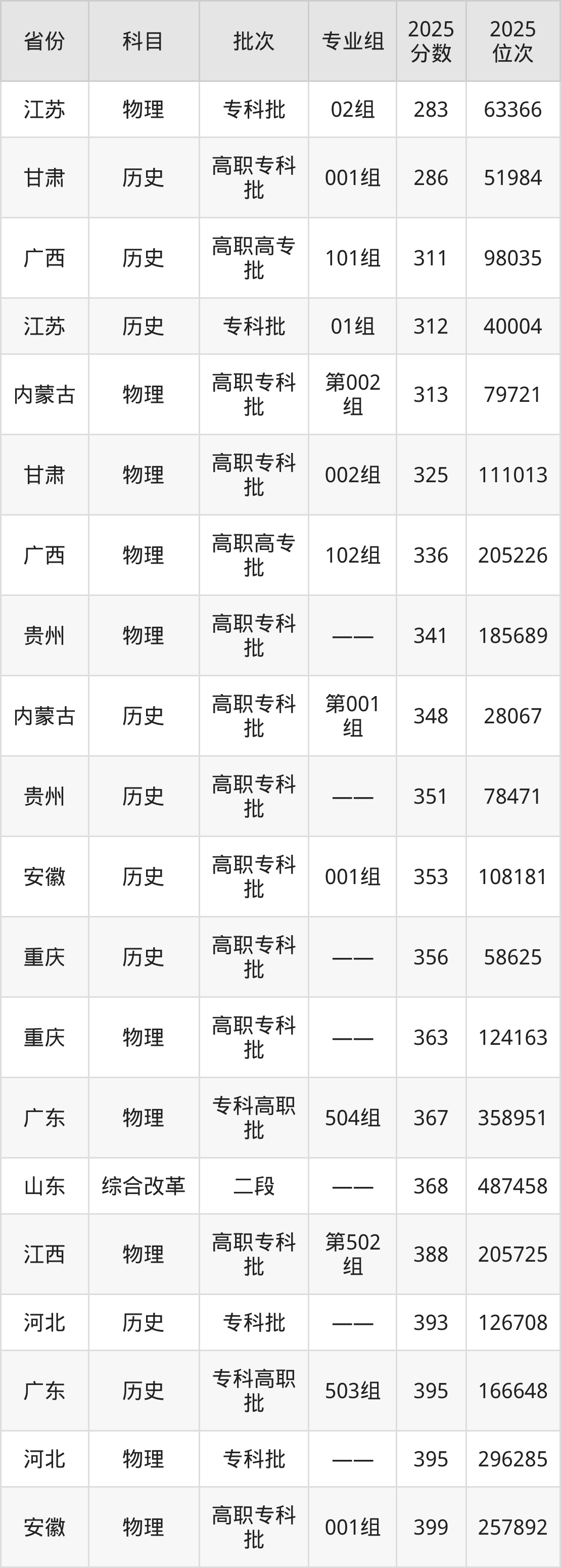 最低录取分数线是283分,对应位次是63366名,招生地区为江苏;