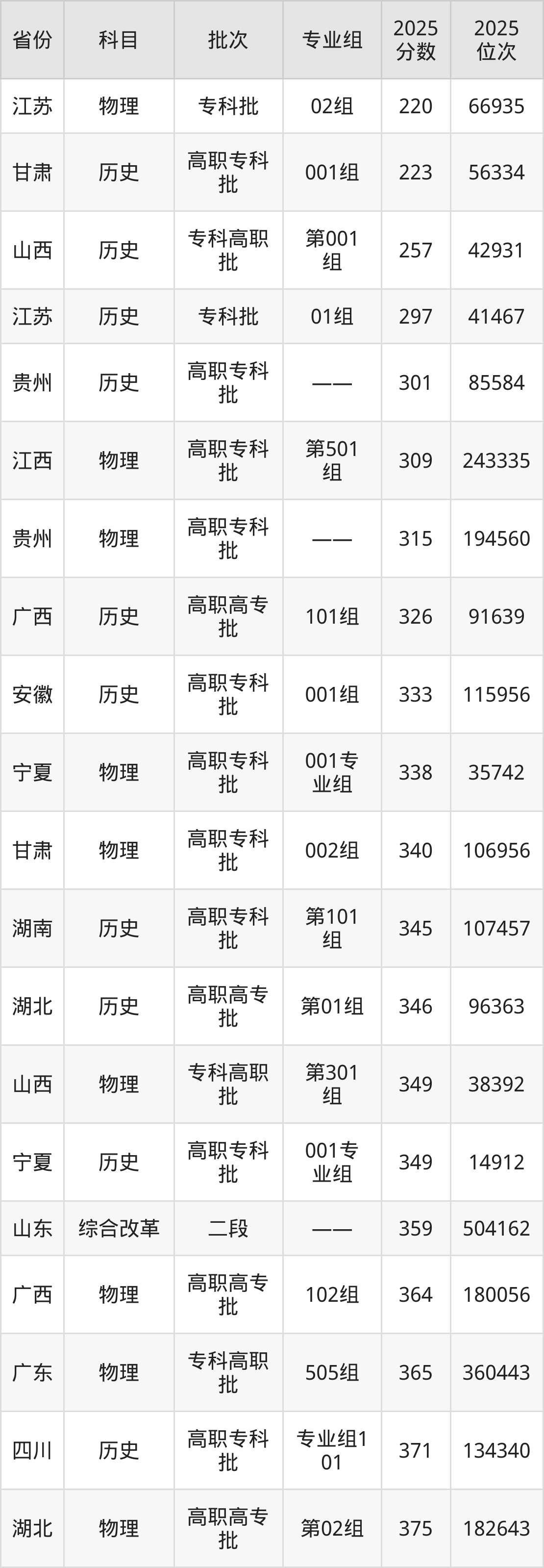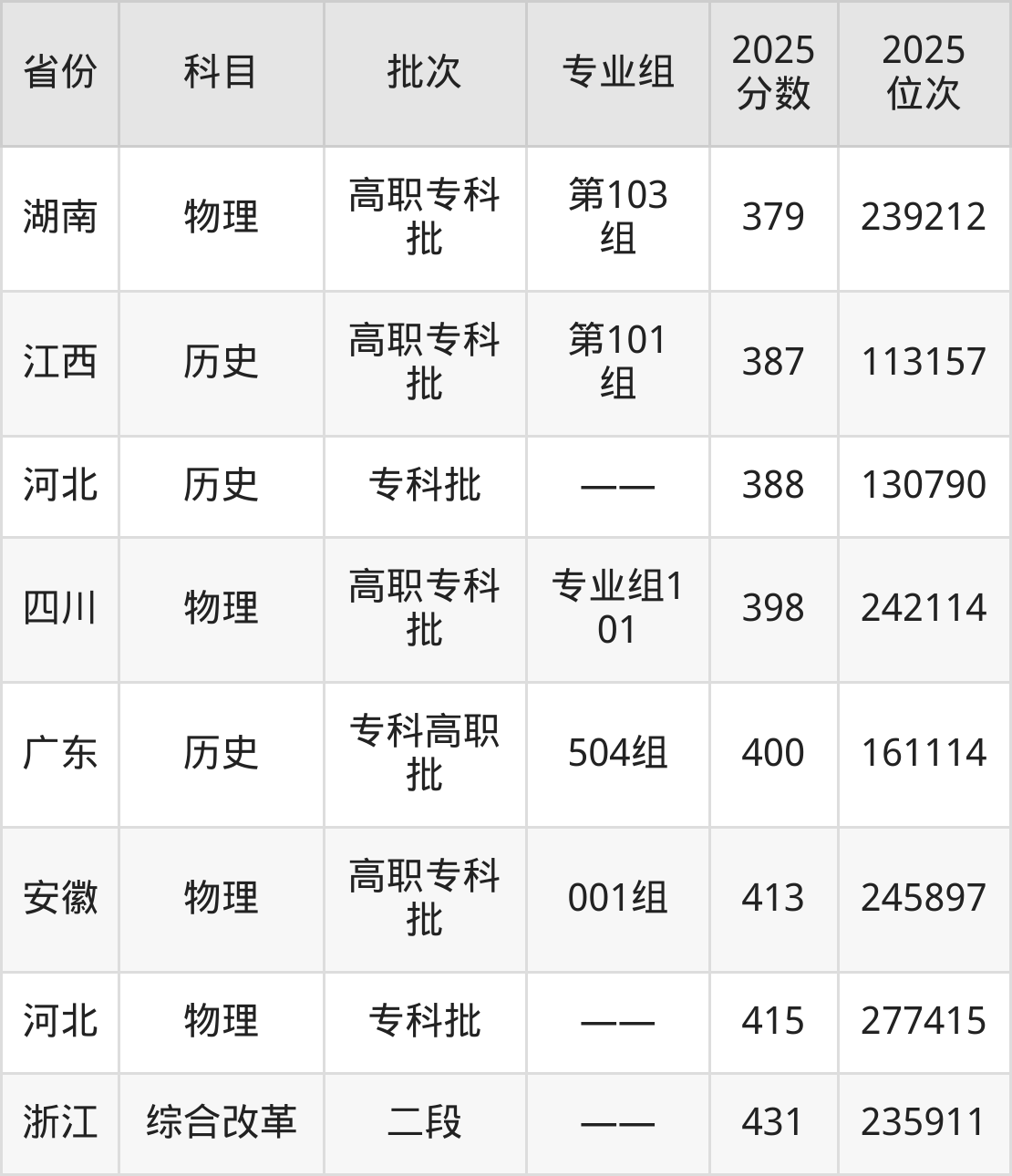 2025年江西工业工程职业技术学院在各省普通批录取分数线一览表:
