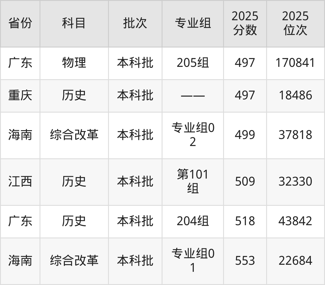 最低录取分数线是499分,对应位次是37818名,招生地区为海南;