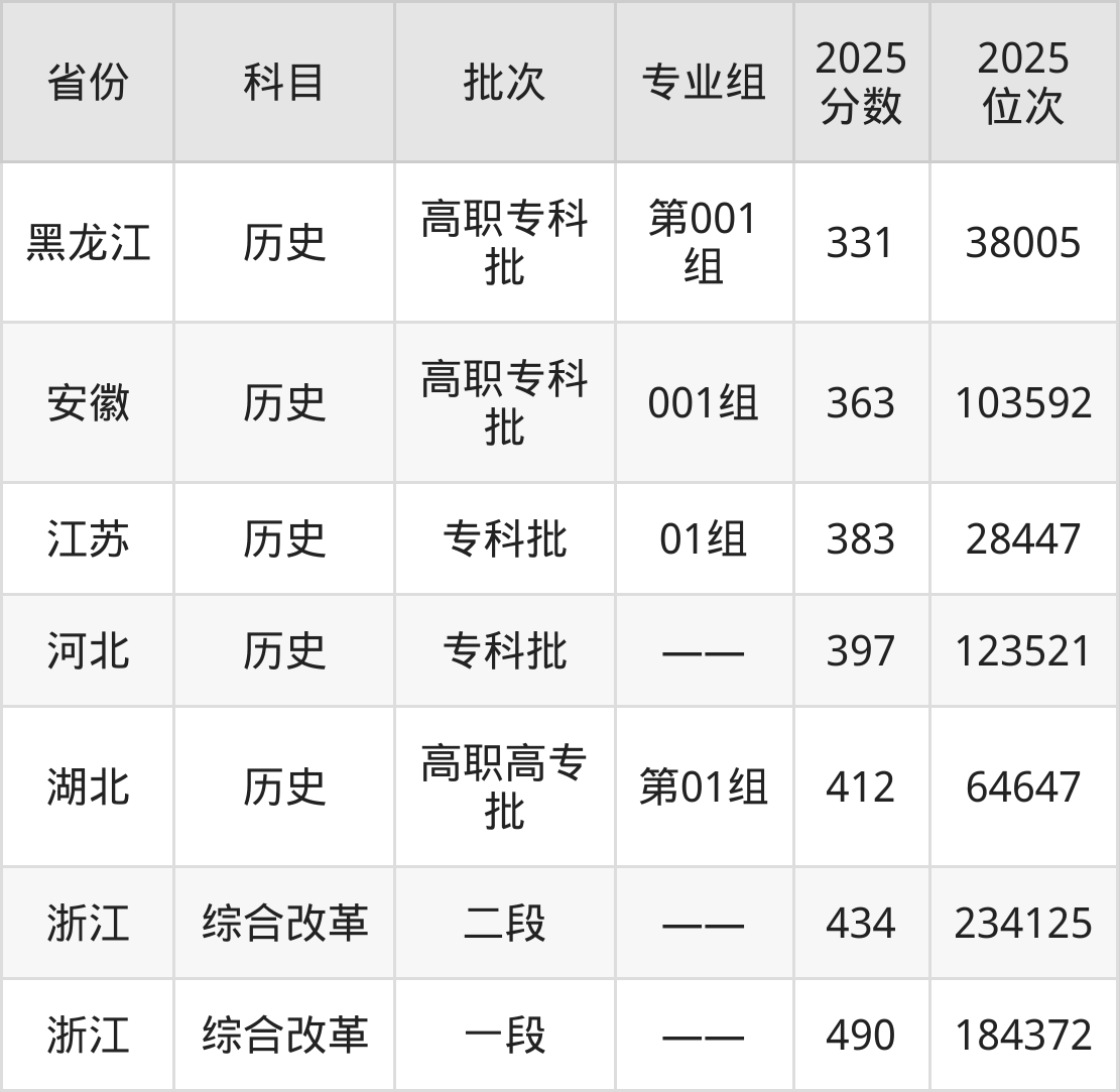 2025年绍兴职业技术学院在各省历史类的录取分数线位于331分-412分之间。