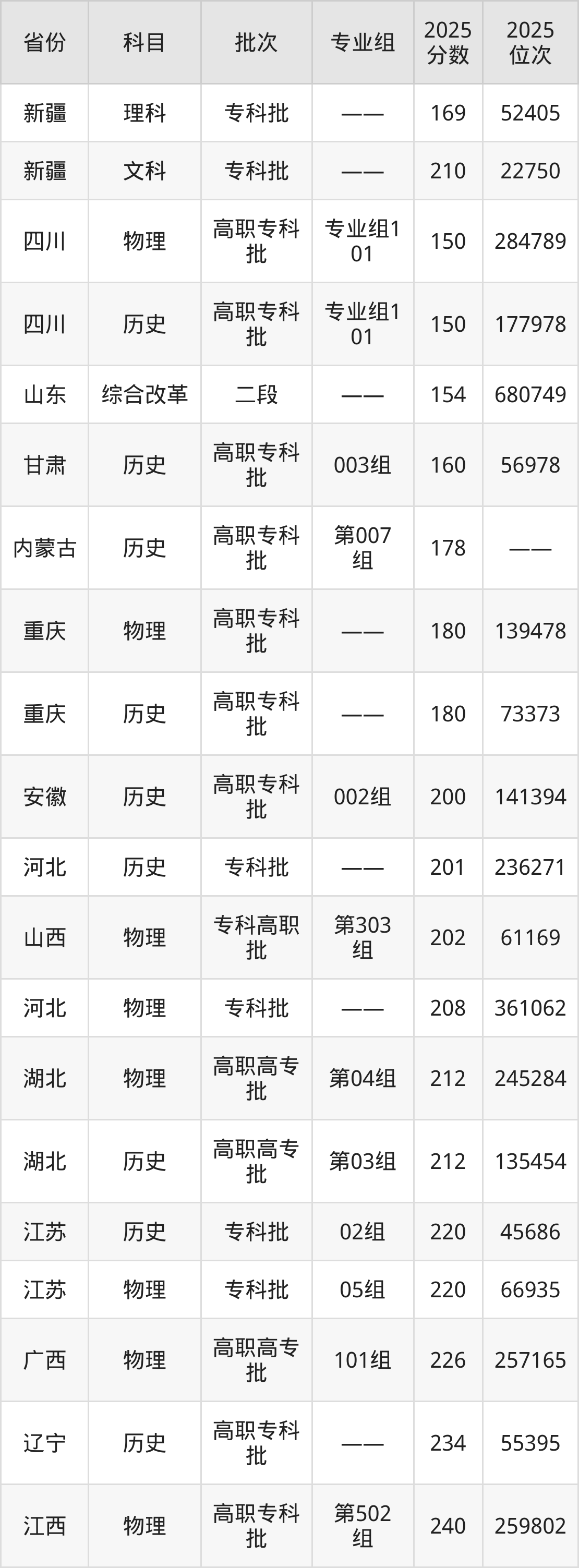最低录取分数线是150分,对应位次是177978名,招生地区为四川;
