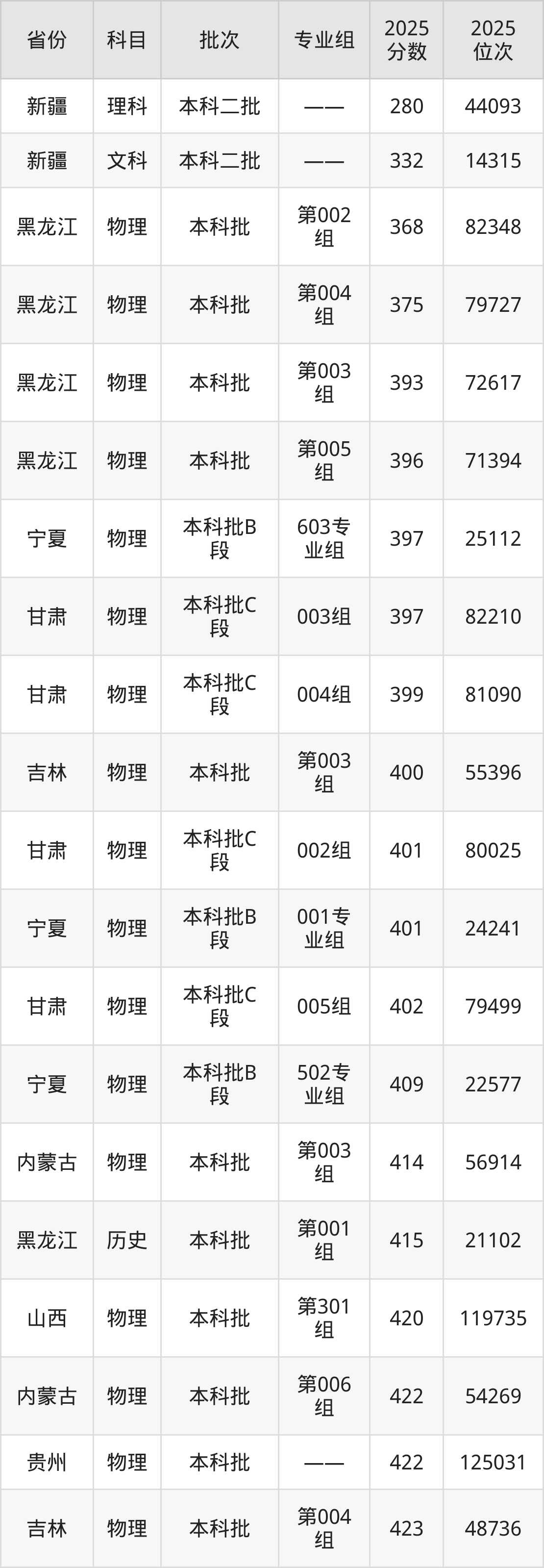 最低录取分数线是280分,对应位次是44093名,招生地区为新疆;