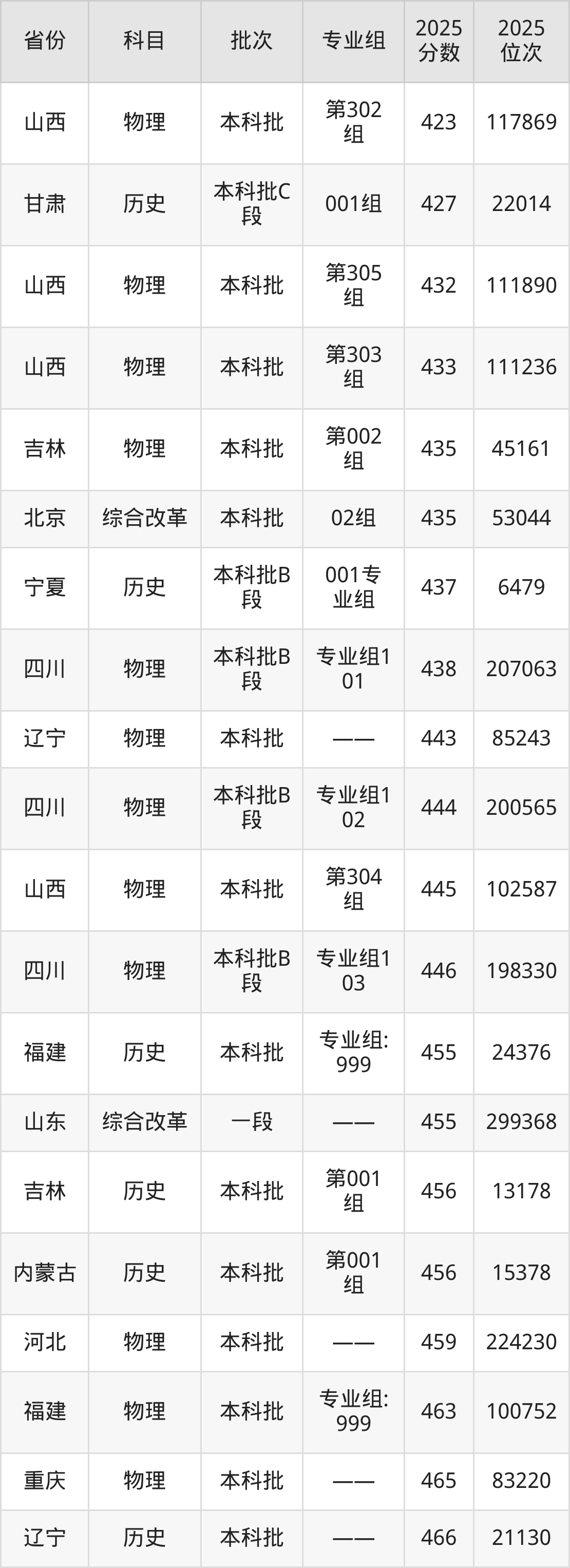 最低录取分数线是435分,对应位次是53044名,招生地区为北京;