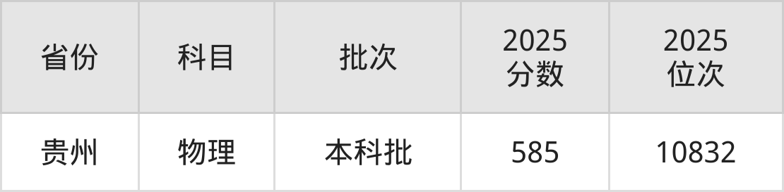 最低录取分数线是585分,对应位次是10832名,招生地区为贵州。