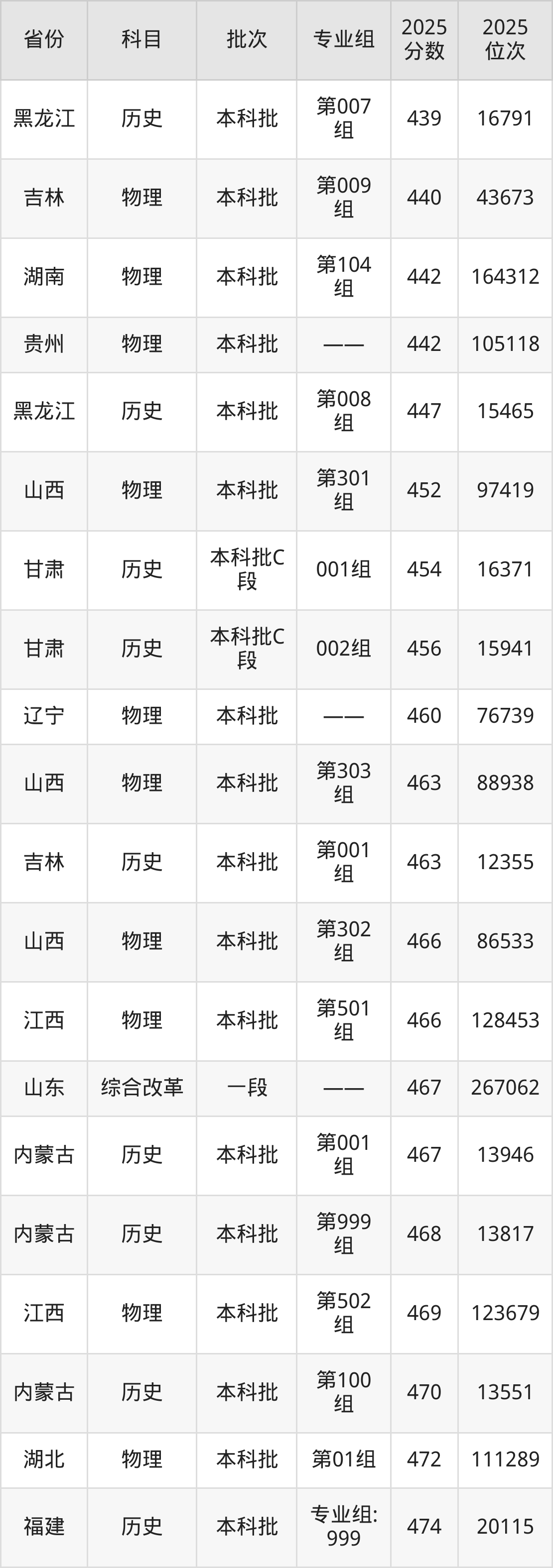 最低录取分数线是467分,对应位次是267062名,招生地区为山东;