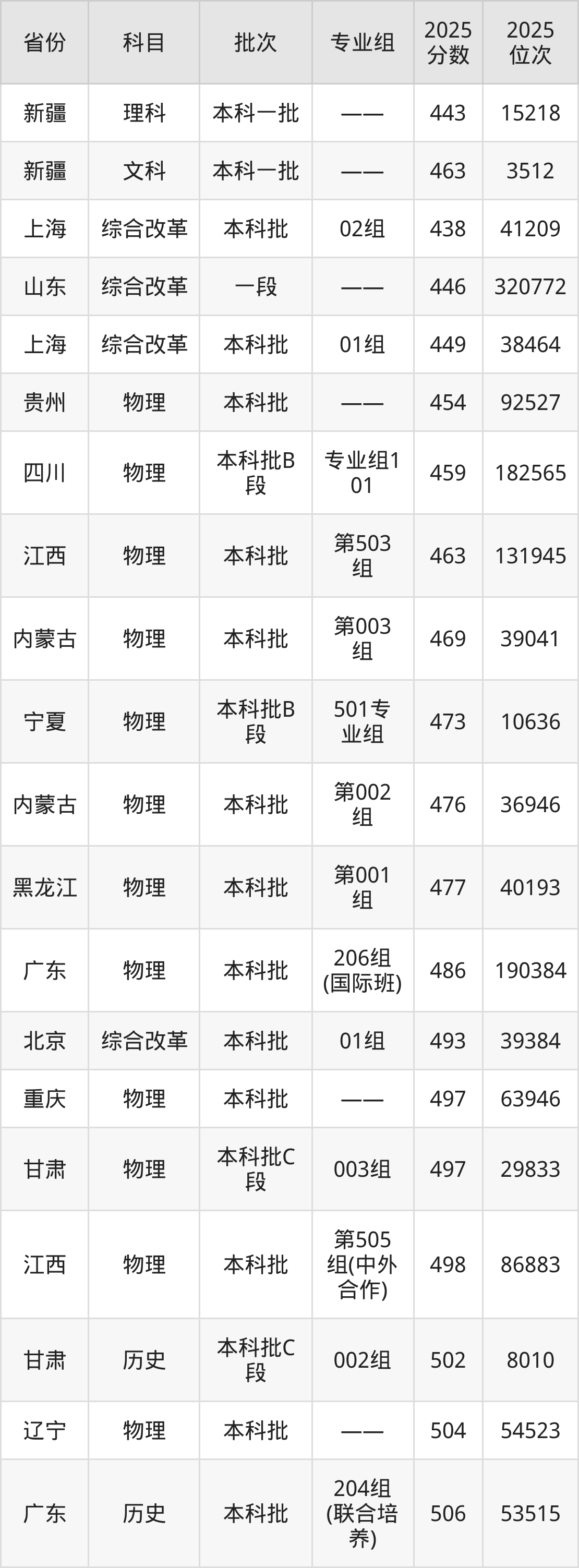 最低录取分数线是443分,对应位次是15218名,招生地区为新疆;