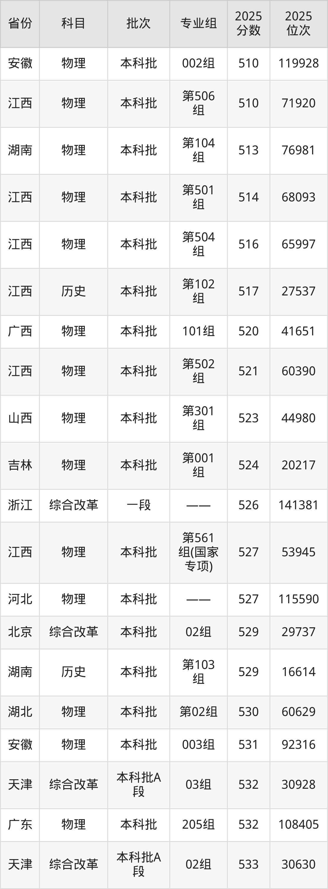 2025年东华理工大学在各省普通批录取分数线一览表: